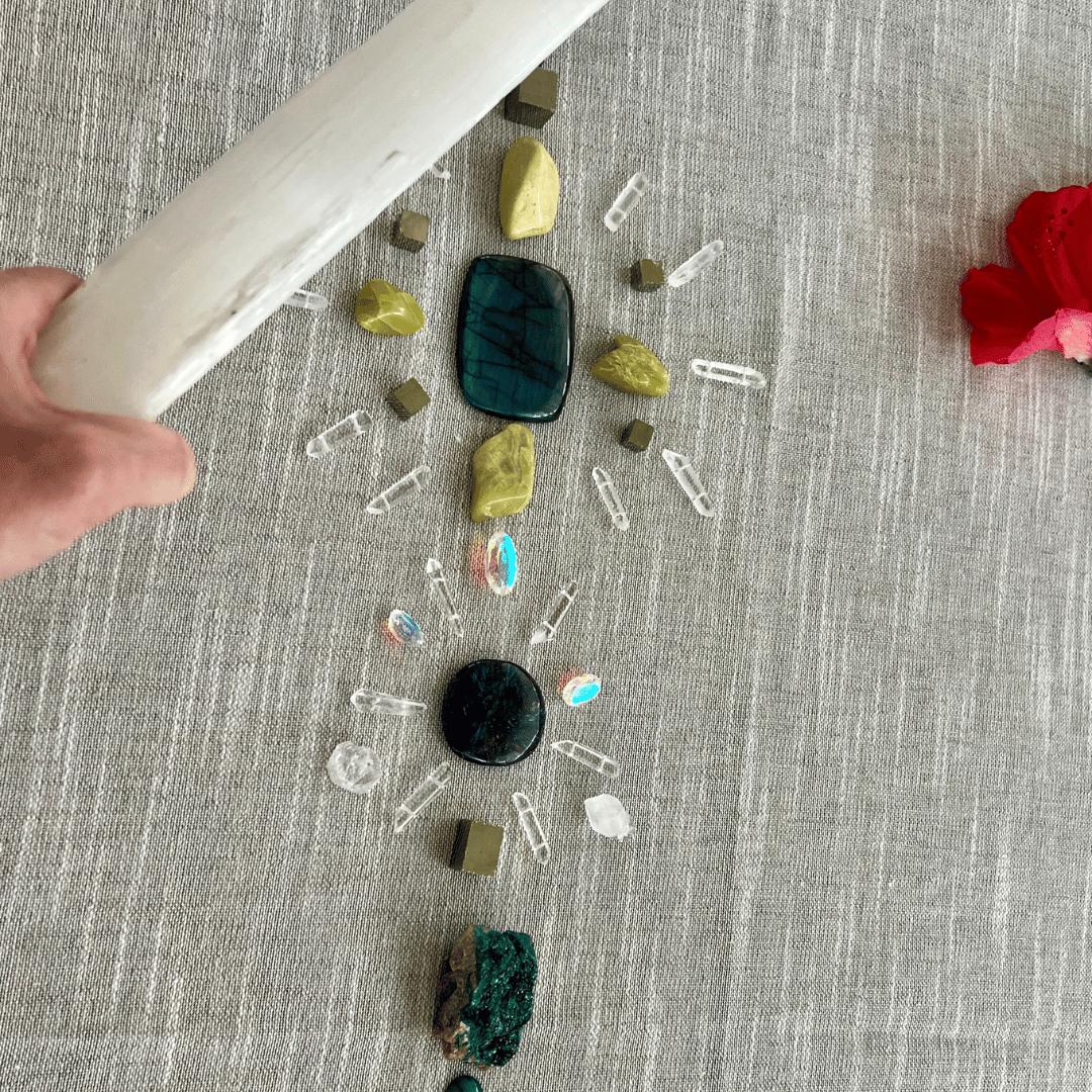 During a crystal energy session, chosen stones are placed directly on the body or used in remote healing practices. Crystal grids and mandalas are often arranged around the chakras and aura, activating energy centers and encouraging deep alignment.